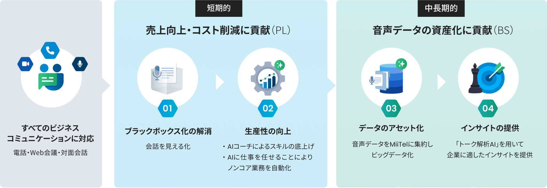 電話・Web 会議・対面など、あらゆる会話を自動で解析し「誰が」「何を」「どう話したか」をデータ化。成果向上とコスト削減を同時に実現し、音声データを継続的な学習資産へと蓄積します。「音声解析プラットフォーマー」として、全ての音声コミュニケーションをビックデータ化することにより、企業におけるAI活用の可能性を最大化し、生産性向上に貢献します。